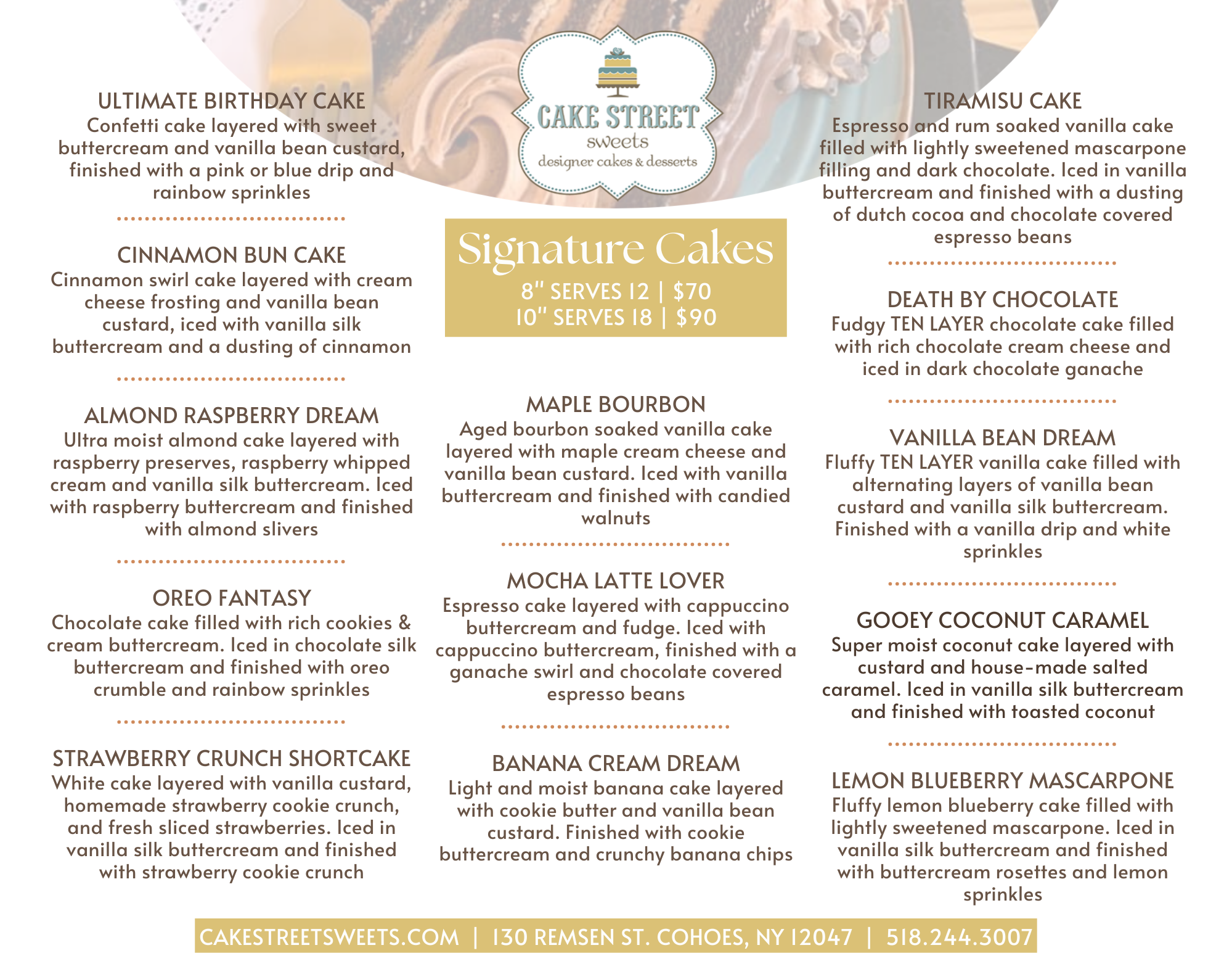 Extra $ for extensively decorated cakes, ganache frosting, fresh fruit fillings, chocolate, rum, carrot, red velvet, and bourbon cakes.
